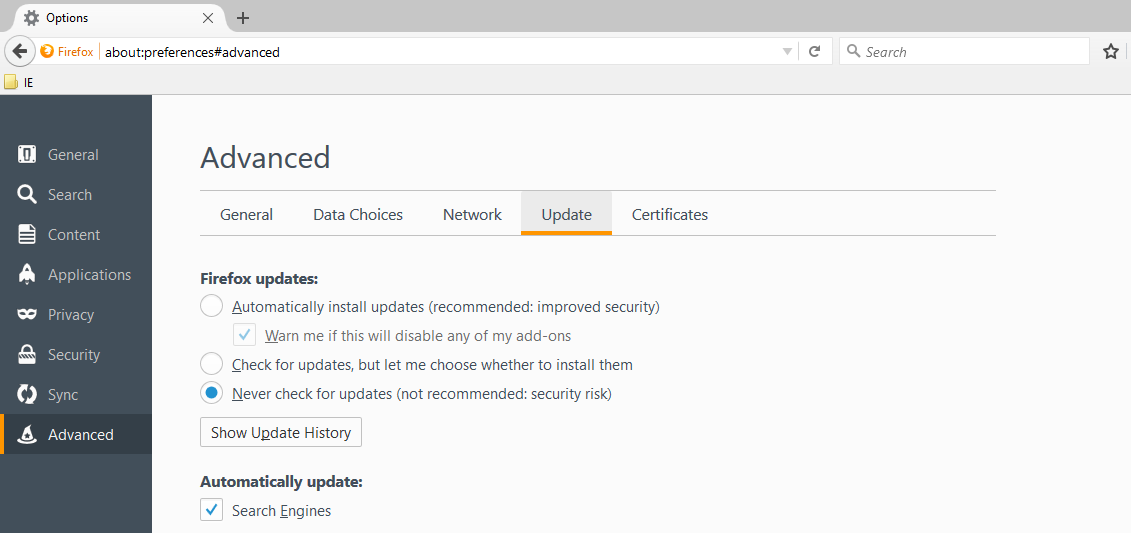 Navegue no Firefox por: Tools –> Options –> Advanced –> Update e marque para NUNCA verificar atualizações (Never check for updates (not recommended: security risk)).